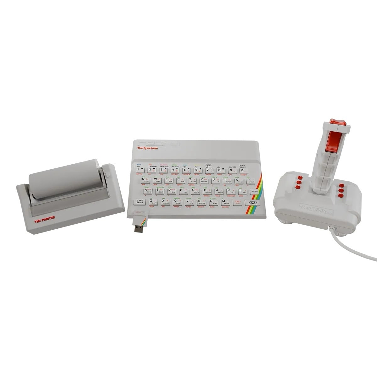 Technisch deckt The Spectrum die 16K-, 48K- und 128K-Modelle ab und bringt die typischen Spiele und das BASIC-Gefühl an aktuelle Bildschirme. Vorinstalliert sind 48 Titel, etwa Manic Miner, The Hobbit, Head Over Heels, Saboteur! Remastered, Army Moves oder The Great Escape. Dazu kommen Komfortfunktionen wie vier Speicherstände pro Spiel und eine Rückspulfunktion von bis zu 40 Sekunden. Wer programmieren oder eigene Sachen ausprobieren will, nutzt den BASIC-Modus mit virtuellen Kassetten. Die Ausgabe läuft über HDMI mit 720p bei 50 oder 60 Hz, wahlweise im 4:3-Modus oder mit pixelgenauen Optionen, optional mit CRT-Filtern für Röhrenoptik. Über USB können eigene Spiele eingebunden werden, unterstützt werden Formate wie TAP, TZX, PZX, SZX, Z80 oder SNA. Insgesamt stehen vier USB-Ports für Controller und Zubehör bereit, was das Set zusammen mit THEPRINTER und dem Quickshot-Joystick recht rund macht.