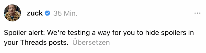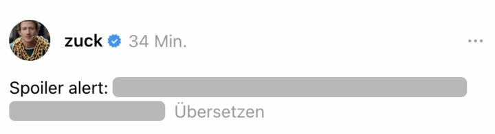Das soziale Netzwerk Threads aus dem Hause Meta wird weiterhin im Hintergrund gepflegt und mit neuen Features versorgt. Wie Mark Zuckerberg nun mitteilte, arbeitet das Unternehmen derzeit daran, das Posten von Spoiler-Informationen komfortabler zu machen. Sprich: Wenn euer Beitrag möglicherweise Inhalte enthält, welche andere Leser nicht unbedingt unfreiwillig erfahren möchten, ohne dies proaktiv freigeschaltet zu haben, könnt ihr dann bald die bekannten grauen Balken über den entsprechenden Textbereich legen, welche ein wenig an Rubbelflächen von Lotto-Gewinnkarten erinnern:
