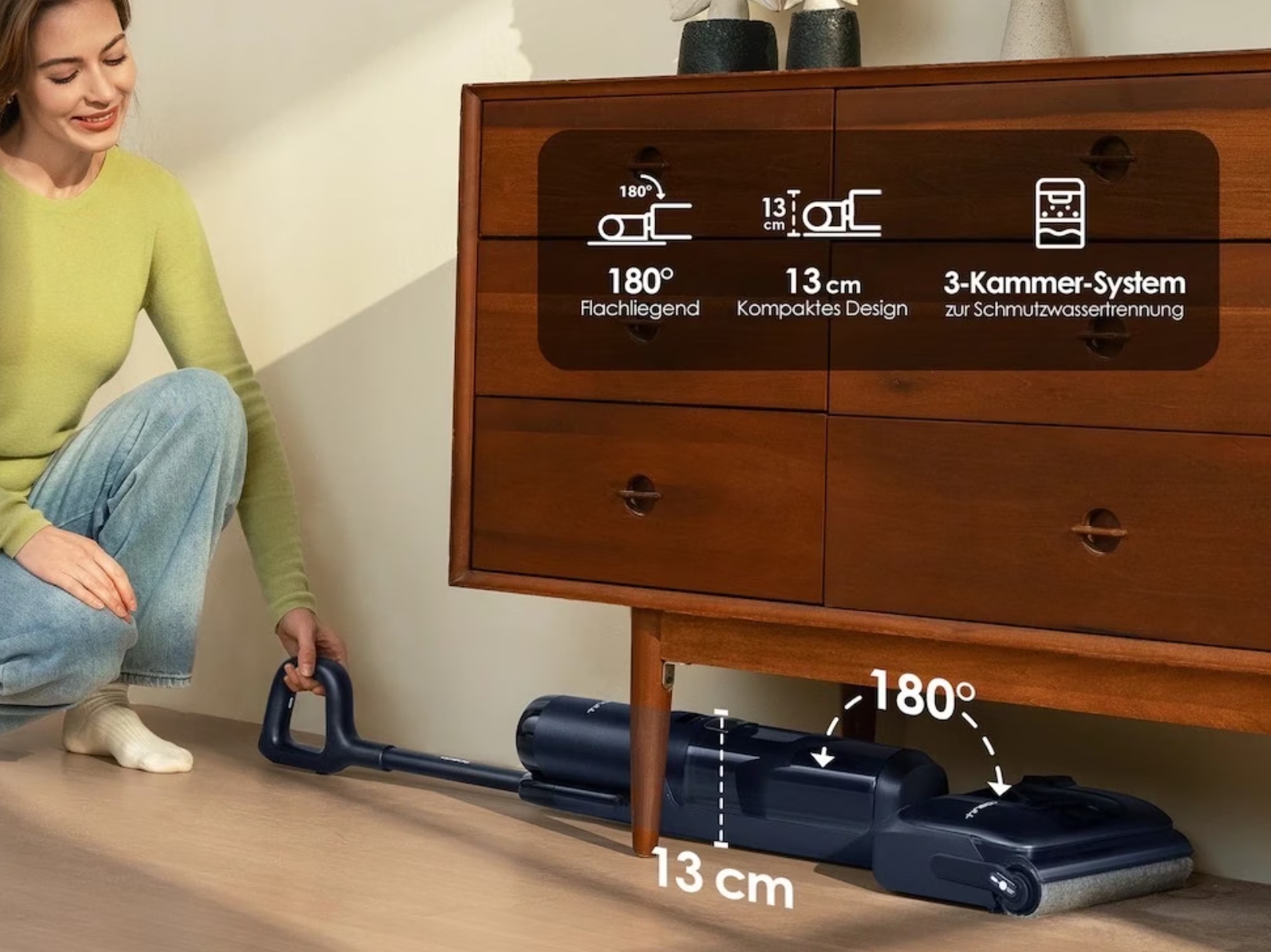 Mit 22.000 Pa Saugleistung, 180°-Flexibilität und geringer Bauhöhe lassen sich auch schwer erreichbare Stellen problemlos reinigen. Die Smooth-Power-Technologie unterstützt durch einen intuitiven Selbstantrieb jede Bewegung und ermöglicht ein müheloses Reinigungserlebnis. Vier Reinigungsmodi – darunter Flüstermodus und schonender Trockensaugmodus – bieten optimale Anpassung an jede Situation.