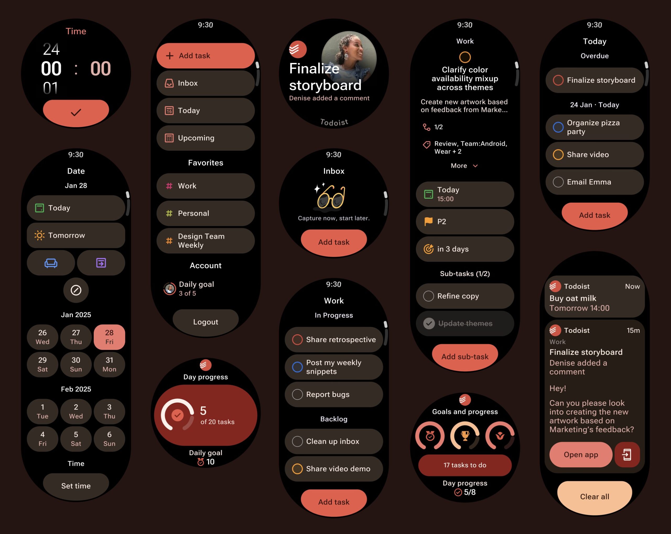 Über konkrete Funktionen spricht man verbal noch nicht, sondern lässt den Teaser für sich sprechen. Das ist eine Ansammlung von Screenshots. Diese zeigen, wie ihr unter Wear OS Tasks hinzufügen könnt, Zugriff auf eure Inbox erlangt und z. B. euren täglichen Arbeitsfortschritt verfolgen könnte.
