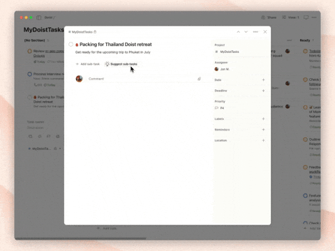 Ihr könnt die Vorschläge direkt übernehmen, anpassen oder mit eigenen Anweisungen verfeinern und neue Vorschläge generieren lassen. Das Feature läuft unter Zuhilfenahme von Todoist Assist und arbeitet komplett auf den eigenen Servern von Todoist. Eure Daten bleiben privat und werden nicht für das KI-Training verwendet. Details dazu gibt es auf der Info-Seite zu Todoist Assist.