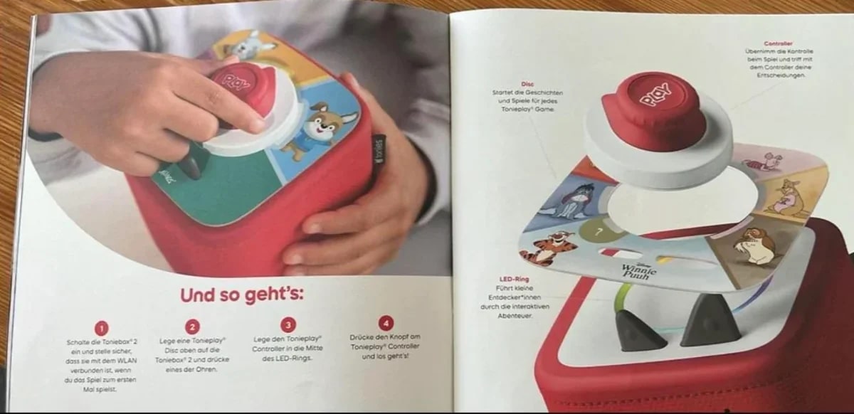 Die neue Toniebox unterstützt eine Funktion namens Tonieplay. Abgebildet auf den aufgetauchten Fotos ist eine „Disc“, die sich auf die Oberseite der Toniebox (sie besitzt Aussparungen für die Ohren) legen lässt. Hierbei handelt es sich um einen Controller für interaktive Inhalte. Das können Spiele, Rätsel oder auch interaktive Lernspiele sein.