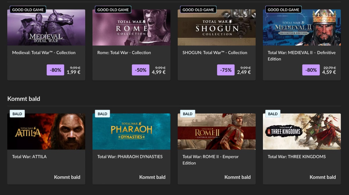 Da die Spiele Teil des Preservation Programs sind, bekommt der Käufer DRM-freie Versionen, die für moderne Systeme fit gemacht wurden. Es bleibt nicht bei diesen vier Spielen. GOG hat bereits angekündigt, dass Total War: PHARAOH DYNASTIES, ROME II, THREE KINGDOMS und ATTILA demnächst folgen werden. Damit dürften einige Lücken in der digitalen Bibliothek geschlossen werden können.