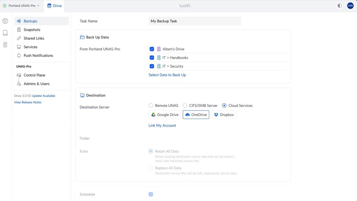 Mit UniFi Drive 2.0 hat man jetzt den ersten größeren Software-Sprung, mit diversen Neuerungen, vorgestellt. Diverse andere Funktionen wurden verbessert (darunter die Benutzerfreundlichkeit von Backups, das Link-Sharing, Task Center oder die Ausfallsicherheit bei der Remote-Sicherung) Softwareseitig wird UniFi OS 4.2 oder neuer benötigt. Ubiquiti unterstützt jetzt RAID 6 sowie einen dynamischen Hot Spare. Backups lassen sich jetzt auch zu OneDrive und Dropbox schieben. Die Dateiaktivität im Seitenbereich von Laufwerk/Ordner/Datei und Systemprotokolle wurden hinzugefügt.