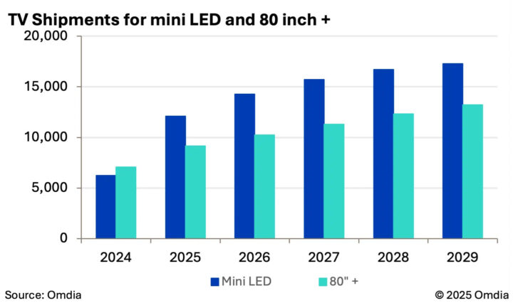 So rechnet Omdia damit, dass die weltweiten Auslieferungsmengen von TV-Geräten mit mindestens 80 Zoll Diagonale zwischen 2025 und 2029 um 44 % wachsen dürften. Das wäre insbesondere im Vergleich mit dem Gesamtmarkt beeindruckend, denn für das TV-Segment insgesamt rechnet man innerhalb der nächsten fünf Jahre nur mit minimalem, einstelligen Wachstum. Beflügelt sieht man die Auslieferungsmenge der besonders großen TV-Geräte auch durch fallende Preise von LCD-TVs und Fortschritten bei hochwertigen Mini-LED-Hintergrundbeleuchtungen.