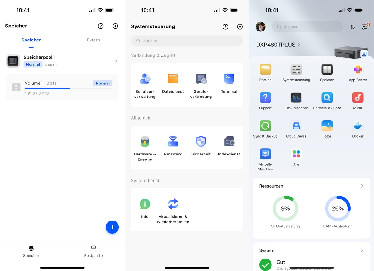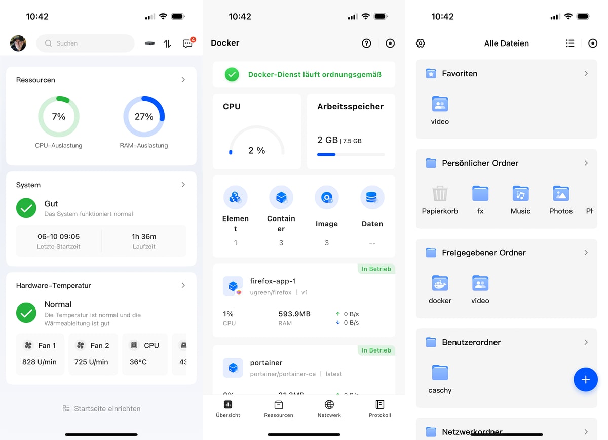 Grundsätzlich ist die Hardware wirklich sehr leistungsstark, wobei man natürlich sehen muss, was man alles mit virtuellen Maschinen machen möchte. Da bin ich dann doch bei mehreren Instanzen lieber auf einem stärkeren Rechner unterwegs. Aber ansonsten: Docker, normale Arbeiten, dies das – problemlos. Der große Pluspunkt ist natürlich die Laufruhe. Man hat keine mechanischen Festplatten, die rumrödeln. Dennoch sind im Ugreen DXP480T Plus Lüfter verbaut. Die kann man nach sehr langen Sessions auch mal hören, sie sind aber auf keinen Fall so störend wie entsprechende Festplatten.