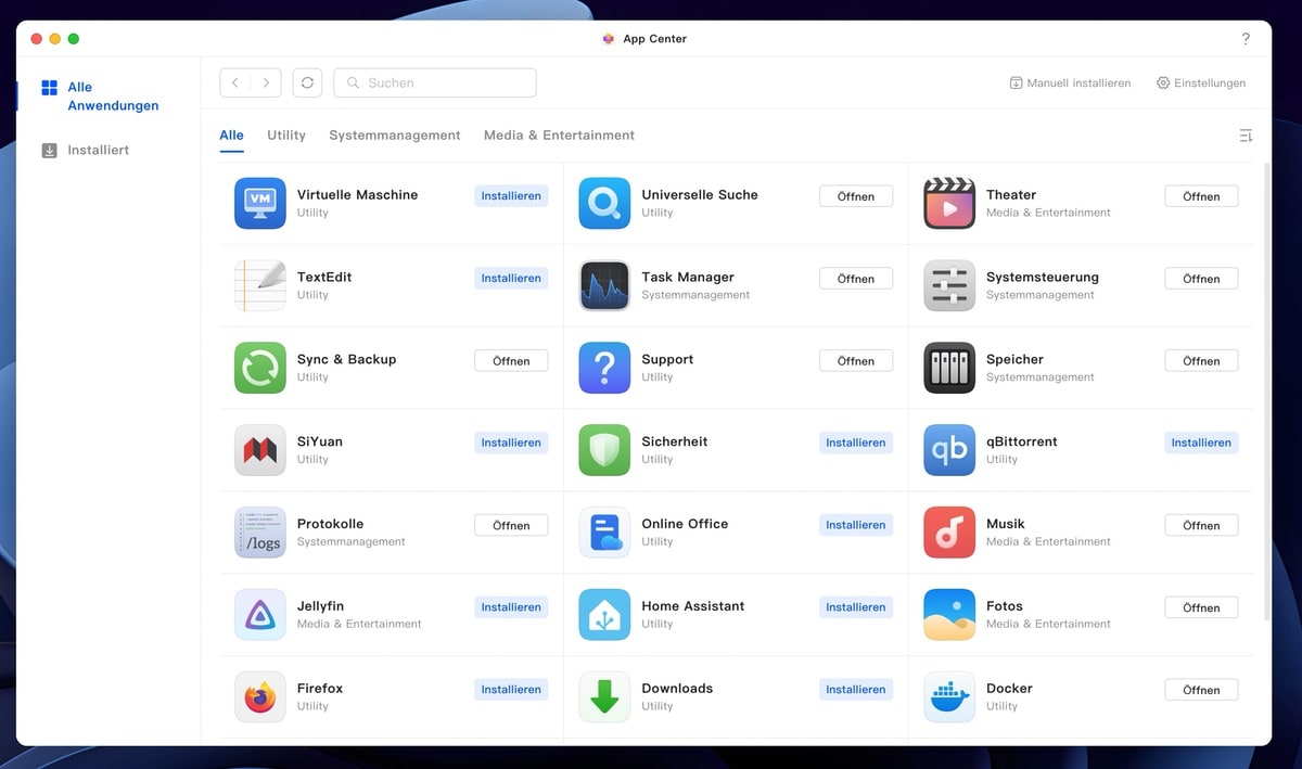 Ugreen liefert ein App-Center mit, das ganze System ist seit der Veröffentlichung der ersten Produkte meiner Meinung nach stark verbessert worden. Damals hatte ich so meine Problemchen, mittlerweile kann ich recht gut mit der Software arbeiten. An Bord ist auch Unterstützung für virtuelle Maschinen und Docker, was natürlich wichtig ist – zumindest für mich. Ideal für Plex, Portainer und andere Dienste, die man so auf einem NAS hosten möchte. Nett: Jellyfin ist direkt im App Center dabei.