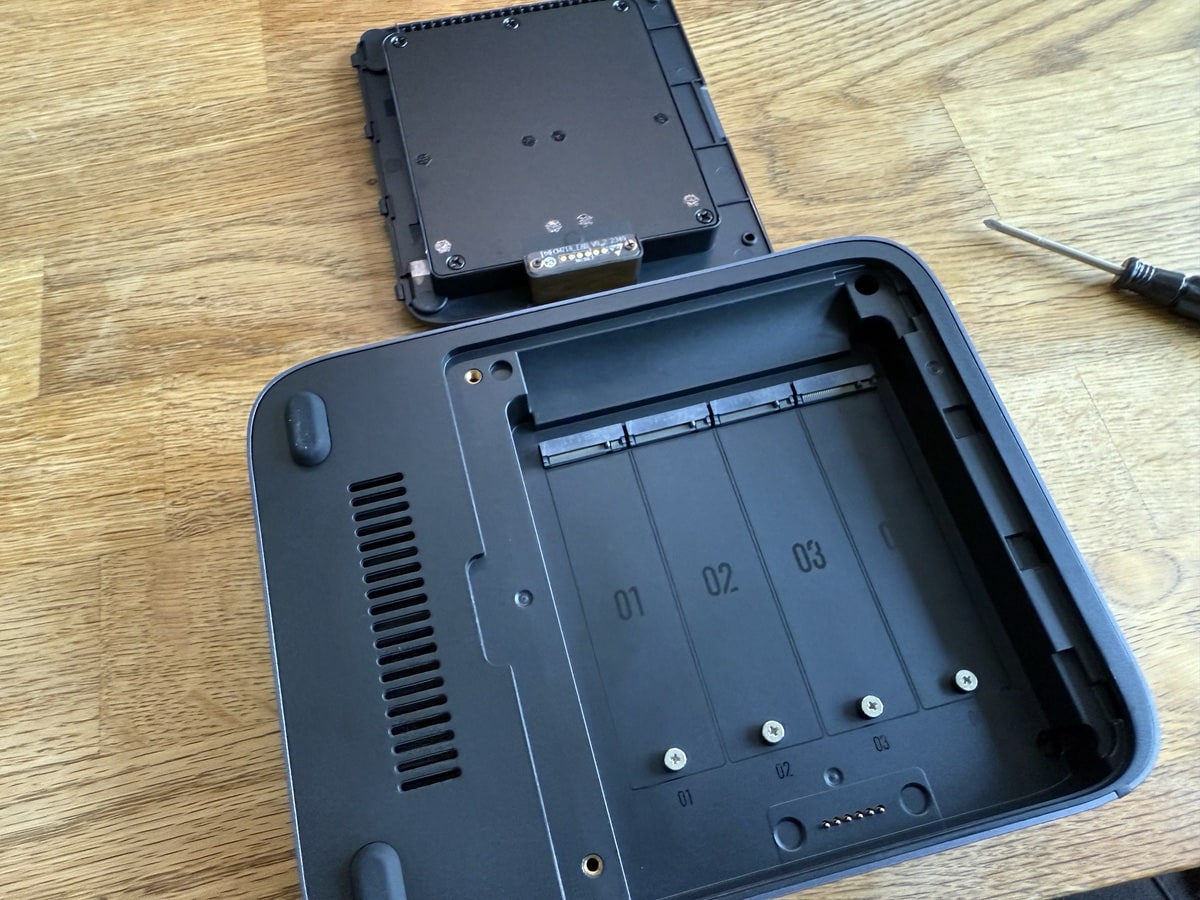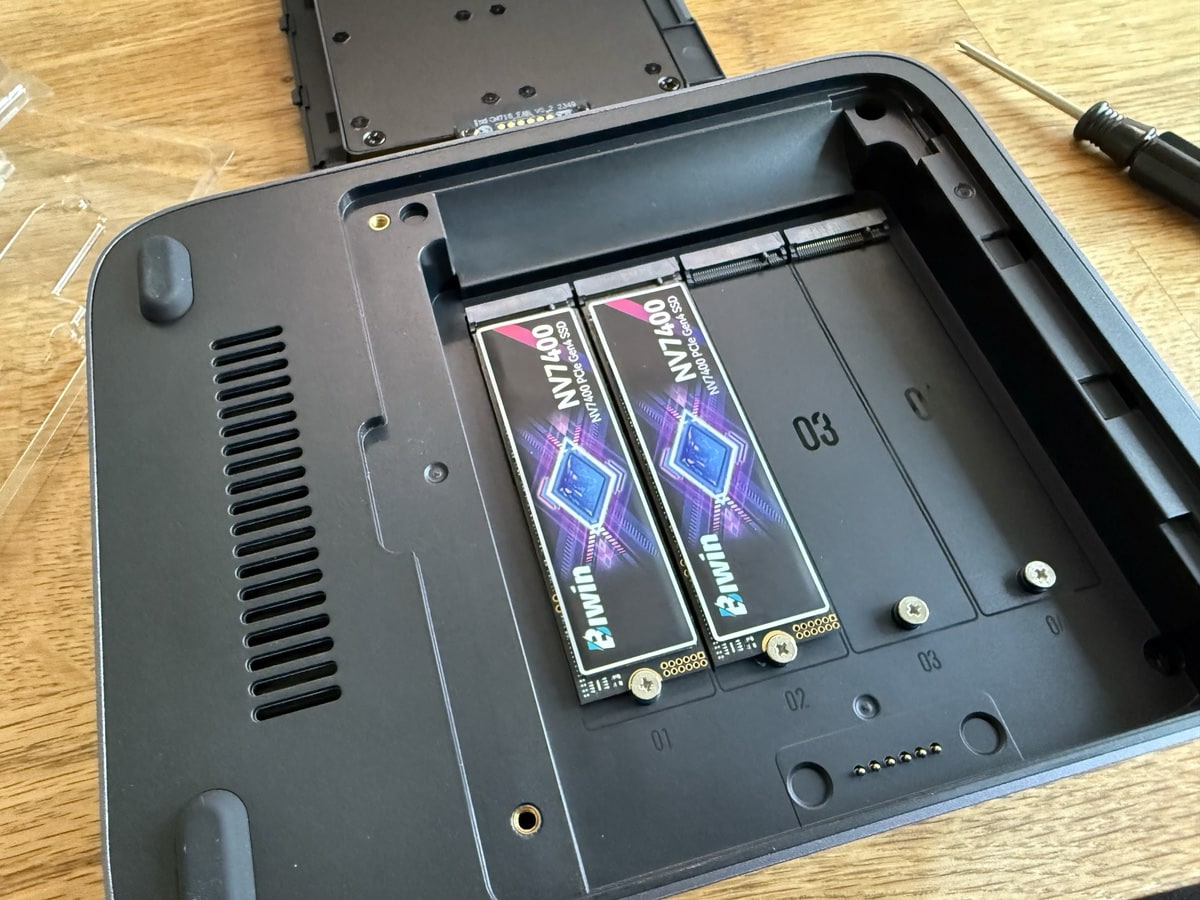 Die Konnektivität wird durch Wi-Fi 6 ergänzt, was besonders bei kabellosen Verbindungen von Vorteil ist. Mit seinen kompakten Abmessungen von 17,9 cm x 14,2 cm x 5,2 cm lässt sich das NAS problemlos fast überall integrieren. Zur Speichererweiterung stehen vier M.2 NVMe-Steckplätze zur Verfügung, die einen einfachen Zugriff ermöglichen. Einfach den Deckel aufschrauben, SSDs rein – fertig.