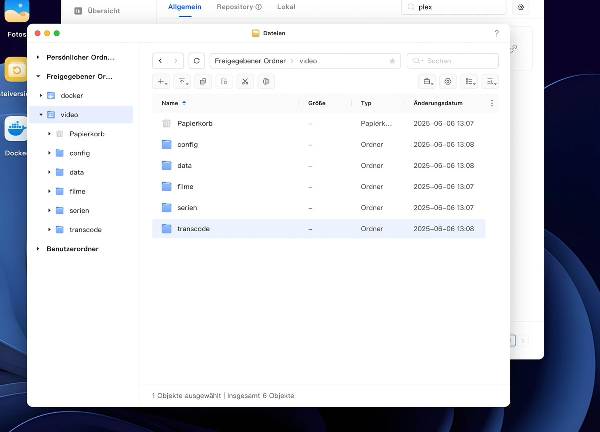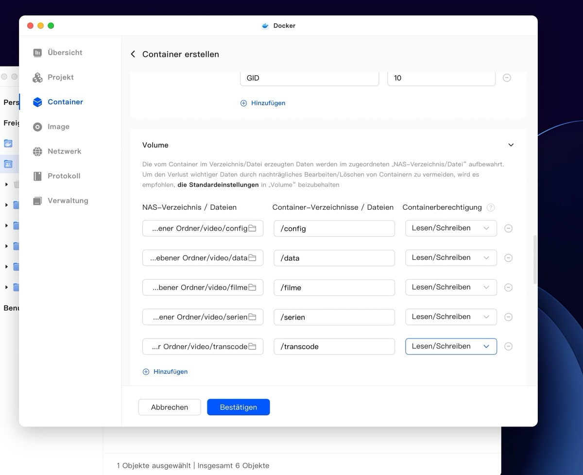In einem Shared Folder werden separate Verzeichnisse für config, data, movies, music, pictures, transcode und tv shows angelegt. Ihr könnt auch statt tv shows und movies etc. das Ganze Serien und Filme etc. nennen. Nun gehts an den Container, den man mal in Docker startet.