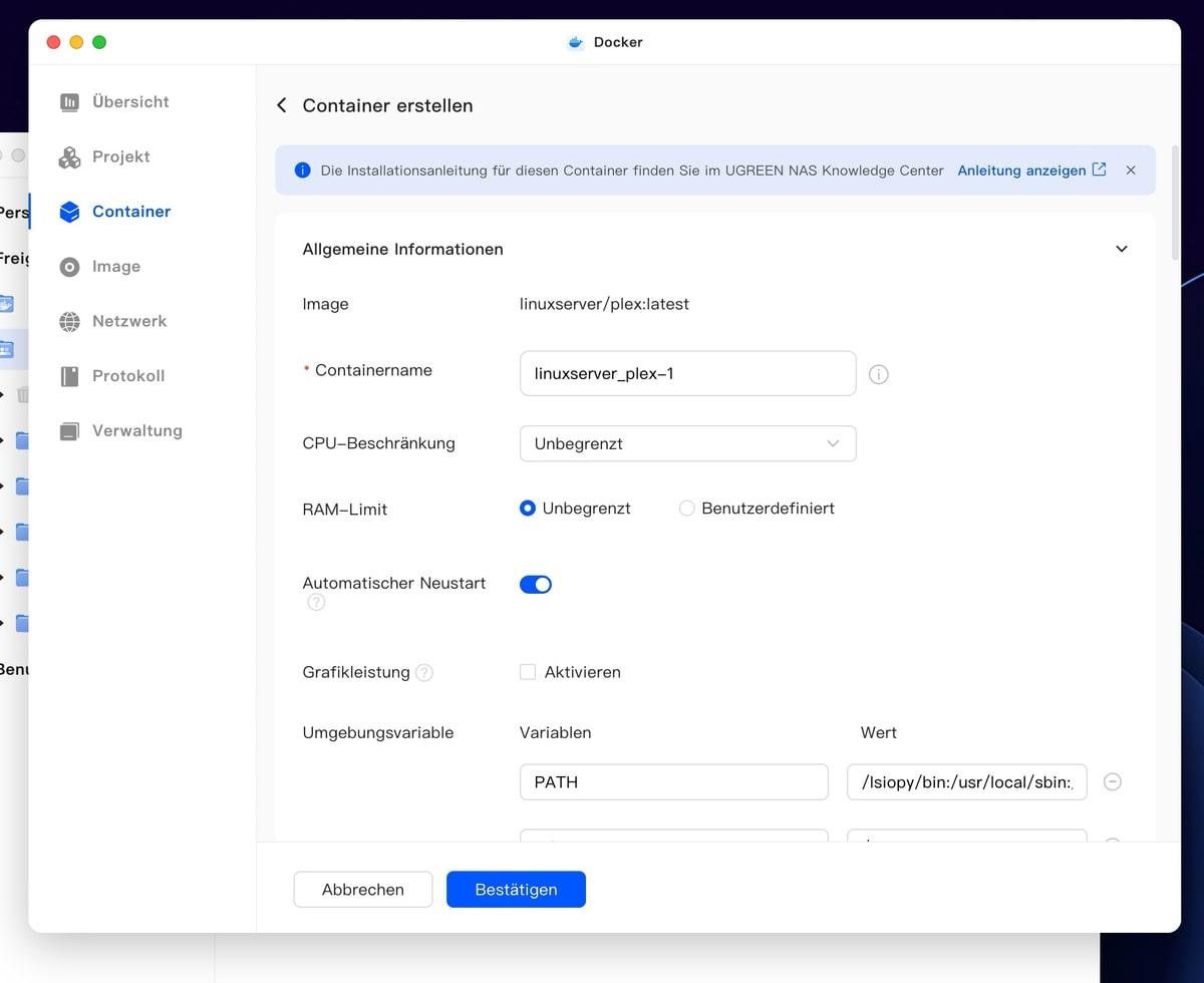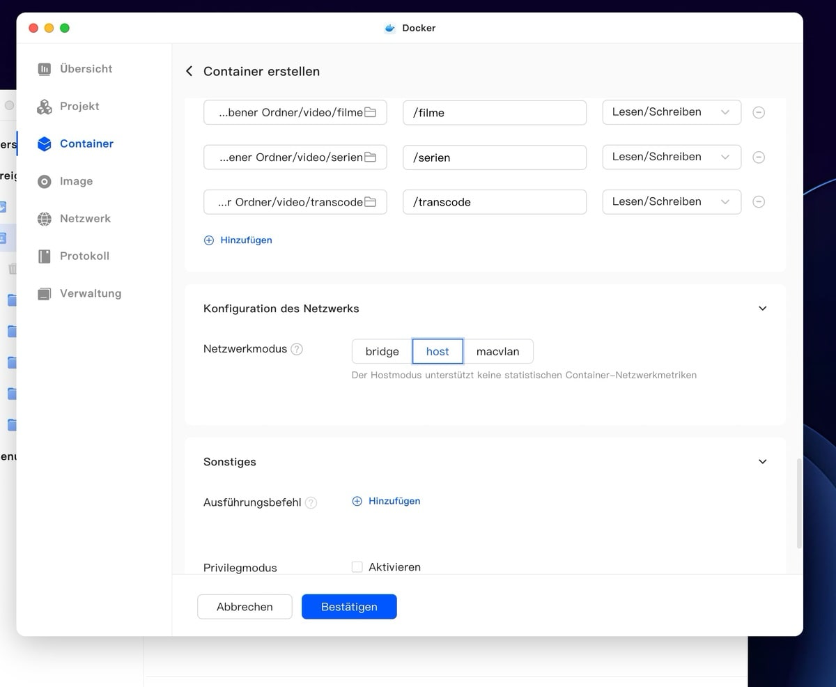 Die Mount Points verbinden die Container-Pfade mit den zuvor erstellten Ordnern. Der Netzwerkmodus wird zumindest bei mir initial auf „Host“ gesetzt, was den einfachsten Zugriff ermöglicht, wenn Docker auf die gleiche Schnittstelle wie euer NAS zugreifen soll. Die Einstellung kann aber später bei Bedarf angepasst werden, etwa wenn Plex an einen bestimmten Port oder eine Netzwerkgruppe gebunden werden soll.
