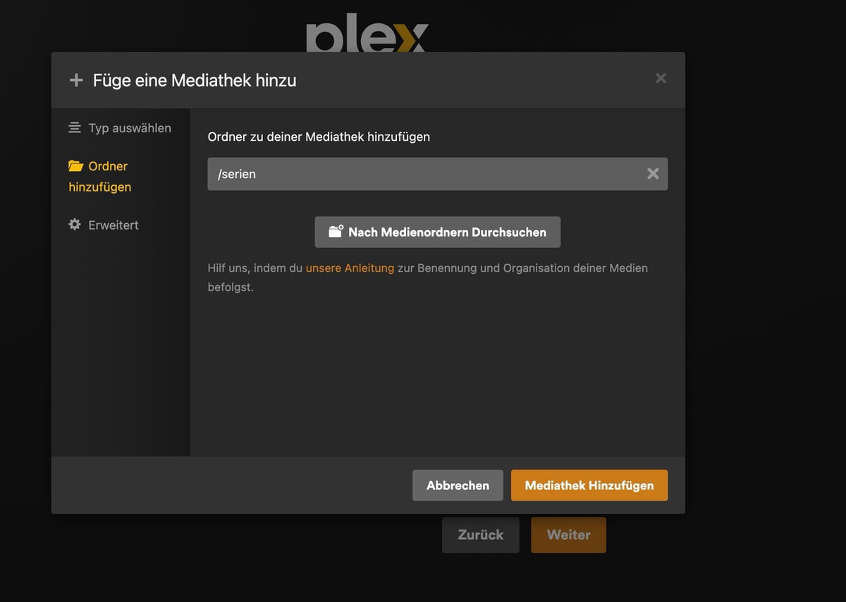 Nach eurer Plex-Anmeldung könnt ihr in der Mediathekenverwaltung noch einmal eure Medienordner hinzufügen. Beim Browsen solltet ihr da direkt die Ordner Serien, Filme, etc. auswählen und zur Mediathek hinzufügen können.