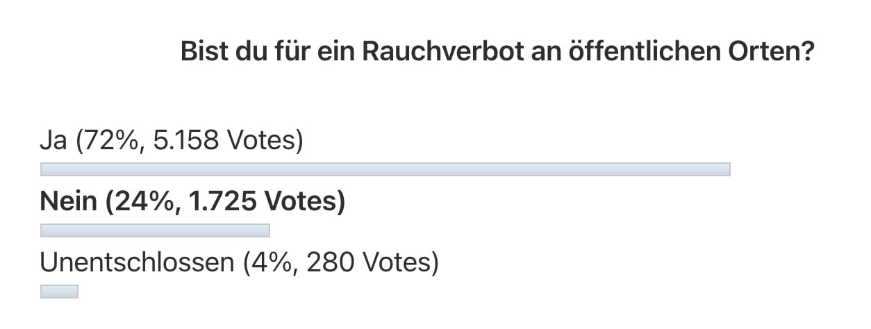 Während in der Kommentarspalte die Diskussion hochkochte, ließ die Umfrage selbst nur klare Auswahlmöglichkeiten. Unsere Leser sind sich größtenteils einig, 72 % der 7.163 Stimmen sind für ein Rauchverbot an öffentlichen Orten. 24 % sind gegen ein Verbot und 4 % sind derzeit unsicher.