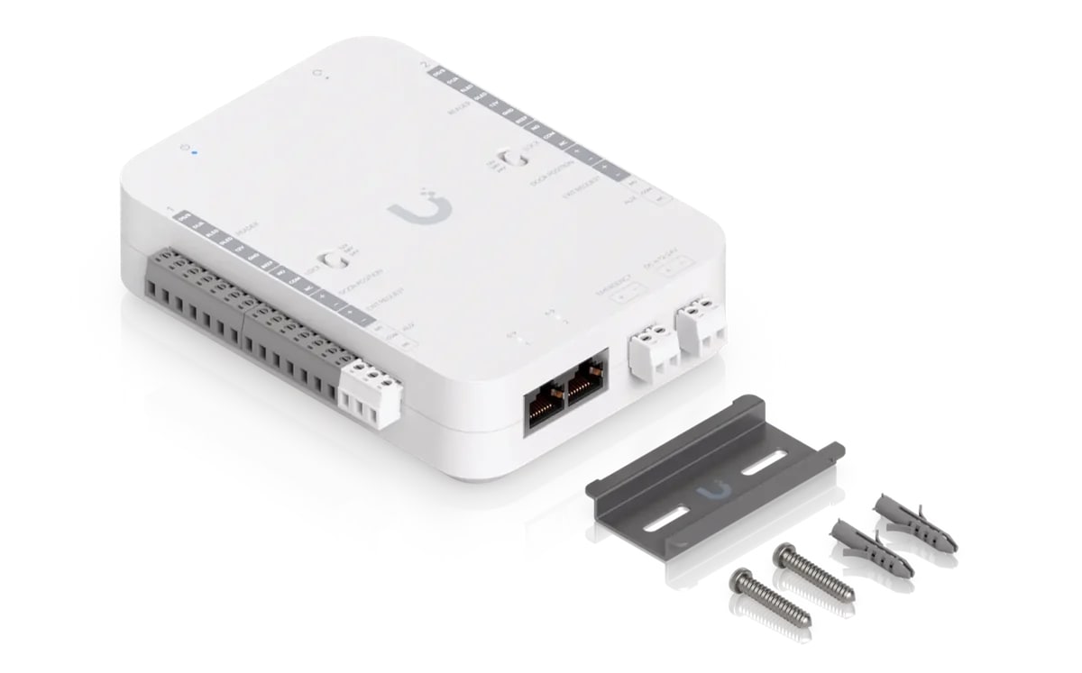 Der Retrofit Hub erlaubt die Ansteuerung von Türschloss-Relais mit 12 bzw. 24V. Gleich zwei Türen lassen sich hier, mit bestehender Verkabelung ansteuern. Auch bestehende Sensoren zur Türposition von Drittanbietern lassen sich hier einbinden. Ebenfalls kann man auch entsprechende Alarmanlagen (z. B. Sirenen) oder ein Strom-Fallback anschließen. Ins Netzwerk geht es mit zweimal Ethernet. Diverse Reader (Ubiquiti nennt jene von Wiegand) sind kompatibel.