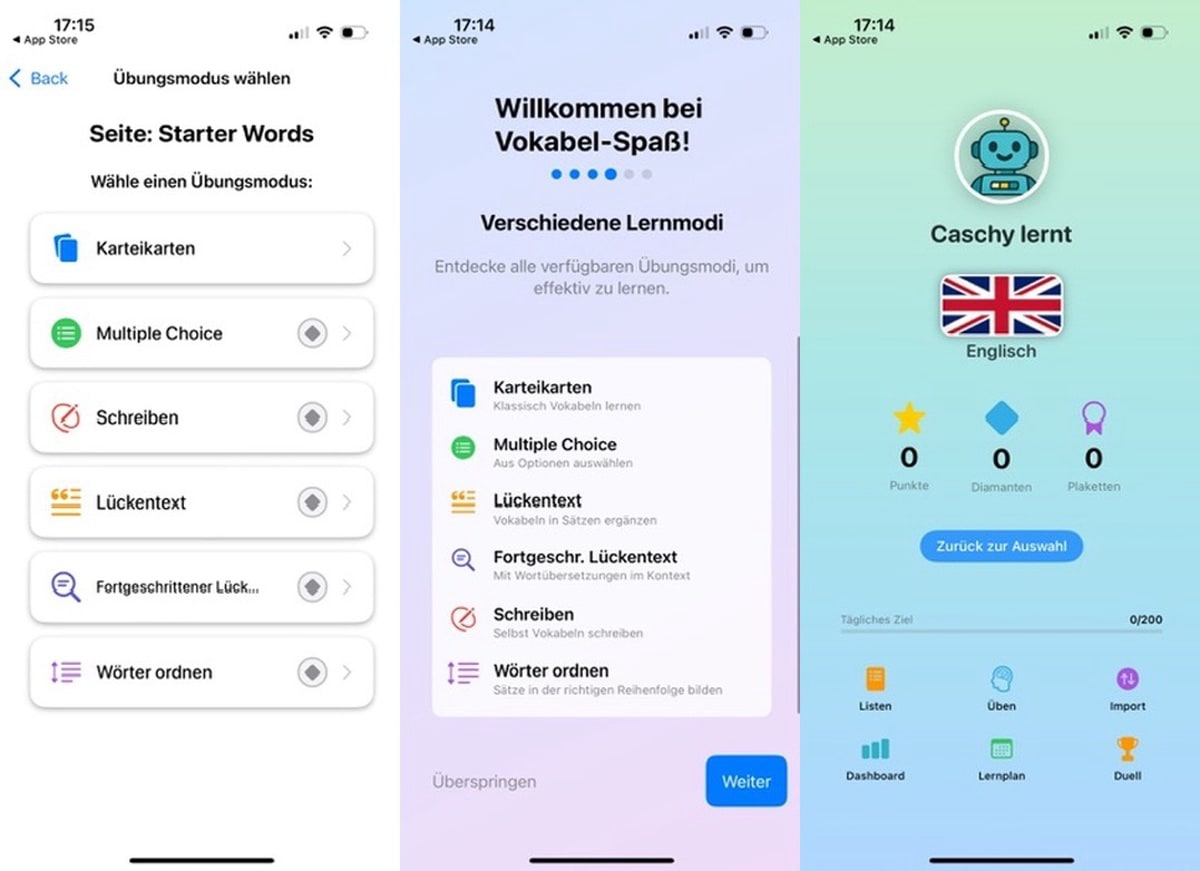 Die App bietet sechs verschiedene Übungsmodi an. Neben klassischen Karteikarten gibt es Multiple-Choice-Aufgaben, zwei Varianten von Lückentexten, Schreibübungen und eine Wortordnungs-Funktion. Der fortgeschrittene Lückentext-Modus ermöglicht zusätzlich wortweise Übersetzungen, was besonders beim Verständnis komplexer Sätze helfen soll.