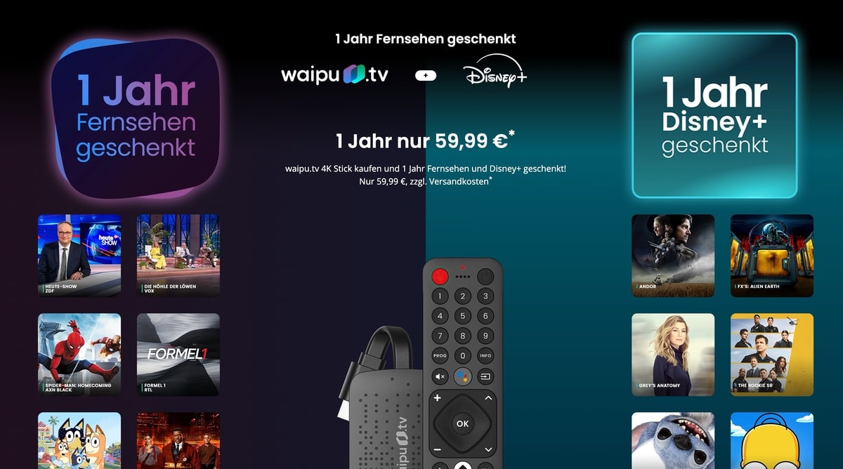 waipu bietet ab sofort ein Bundle bestehend aus dem waipu.tv 4K Stick mit Perfect Plus und Disney+ Standard mit Werbung im Jahrespaket an. Neben der Hardware sind da also ein Jahr lang waipu.tv sowie Disney+ inkludiert. Der Aktionspreis lässt sich ab sofort zu einem Kostenpunkt von 59,99 Euro zuzüglich Versandkosten in Höhe von 4,99 Euro buchen.