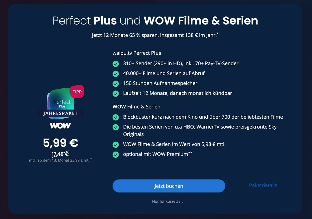 Waipu und der Streaming-Dienst WOW setzen ihre Zusammenarbeit erneut fort und präsentieren ein weiteres Kombi-Angebot. Ab sofort können Interessenten von einem Preisnachlass profitieren: Das Perfect Plus-Paket in Kombination mit WOW Filme & Serien wird für zwölf Monate zum monatlichen Preis von 5,99 Euro angeboten. Vielleicht ist das auch für alle interessant, die neulich etwas über die Preiserhöhung bei Sky und WOW gehört haben und auch noch das TV-Angebot von waipu nutzen wollen.