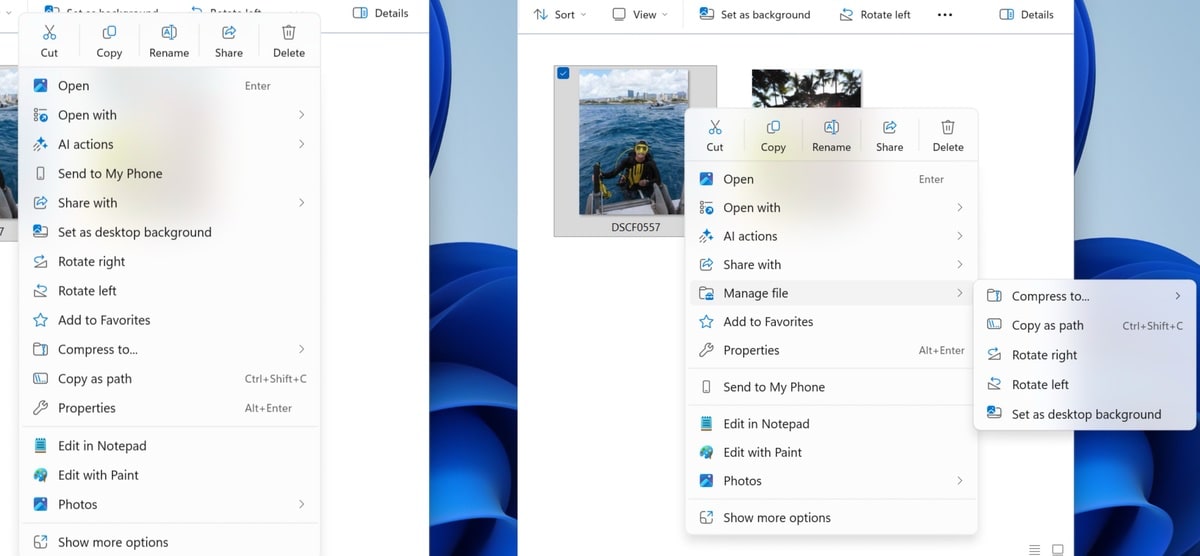 Im Kontextmenü wandern einige der seltener genutzten Einträge in ein neues Untermenü namens „Datei verwalten“. Dort landen Aktionen wie „In ZIP-Datei komprimieren“, „Pfad kopieren“, „Als Desktophintergrund festlegen“ sowie „Nach rechts drehen“ und „Nach links drehen“. Die Funktionen bleiben erreichbar, kleben aber nicht mehr direkt im ersten Level des Menüs. Der Name „Datei verwalten“ ist noch nicht in Stein gemeißelt, Microsoft behält sich Änderungen in kommenden Insider-Builds vor.