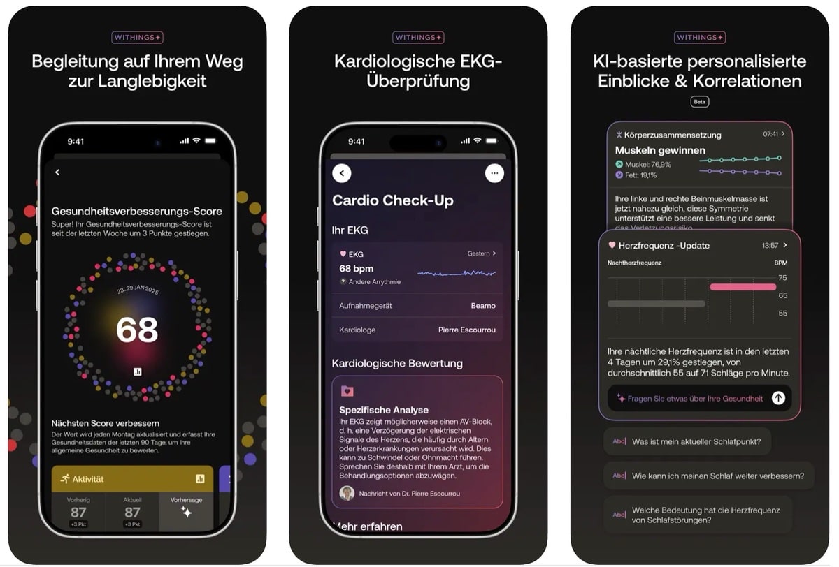 Die Gesundheits-App von Withings hat heute ein größeres Update auf Version 7.6 erhalten. Die Entwickler haben dabei nicht nur an der Oberfläche geschraubt, sondern auch neue Funktionen integriert, die das Gesundheitsmonitoring erweitern. Muss man sehen, ob man das alles braucht und wie sich das zukünftig entwickelt. Früher war das eine Waage mit App-Anbindung, mittlerweile gibts 100 andere Sachen in der App, dazu ein Abo für 100 Euro im Jahr. Ich für meinen Teil brauche das ganze Gedöns nicht, ich brauche nur die Waage und die App-Anbindung. Aber darum soll es ja nicht gehen, sondern die Neuerungen der App.