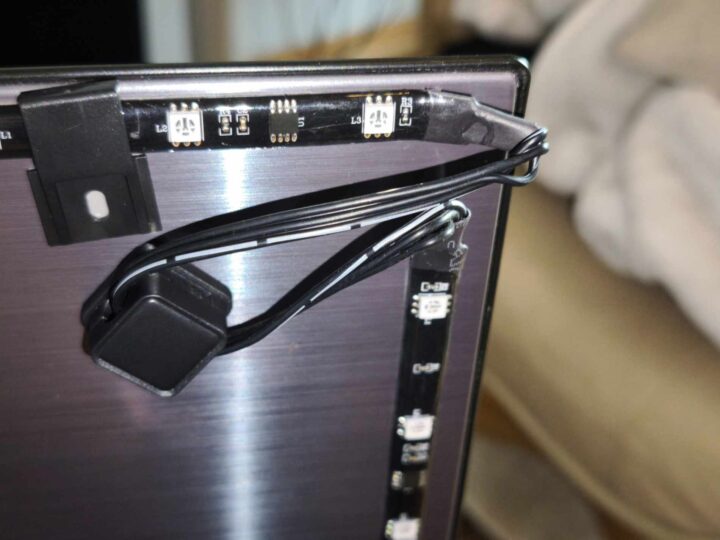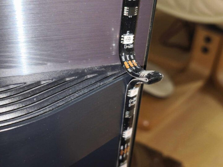 Ich hatte ja im letzten Jahr bei meinem Test der Philips Hue Play HDMI Sync Box 8K auf ein Problem bei OLED-TVs hingewiesen. Zumindest an meinem LG OLED C9 passte der Gradient Lightstrip mehr schlecht als recht ans TV-Gehäuse, weil es eben unten und oben unterschiedlich dick ist. Letzten Endes kam es, wie es wohl kommen musste: Nach einem Wochenendtrip fand ich die ganze Chose abgesprungen auf meinem Lowboard vor – schade. Ist natürlich ein spezielles Problem, das nicht bei allen TV-Modellen auftreten wird. Solltet ihr aber vor dem Kauf im Kopf haben.