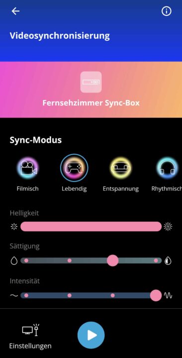 In der App könnt ihr etwa auch einrichten, dass die Box sich automatisch einschaltet, sobald ein HDMI-Signal erkannt wird. Obendrein wählt ihr dort aus vier Synchronisationsmodi: Filmisch, Lebendig, Entspannung und Rhythmisch. Riesig sind die Unterschiede dabei nicht, aber Entspannung sorgt z. B. für eher sanfte, langsame Übergänge zwischen den Farben – gut für einen ruhigen Film geeignet, weniger fürs Gaming. Rhythmisch ist dann im Verhalten etwas „pumpender“, um seinem Namen gerecht zu werden, was visuell zu Musik passt. Meistens solltet ihr mit Filmisch für Filme und Serien und mit Lebendig für Spiele hinkommen.