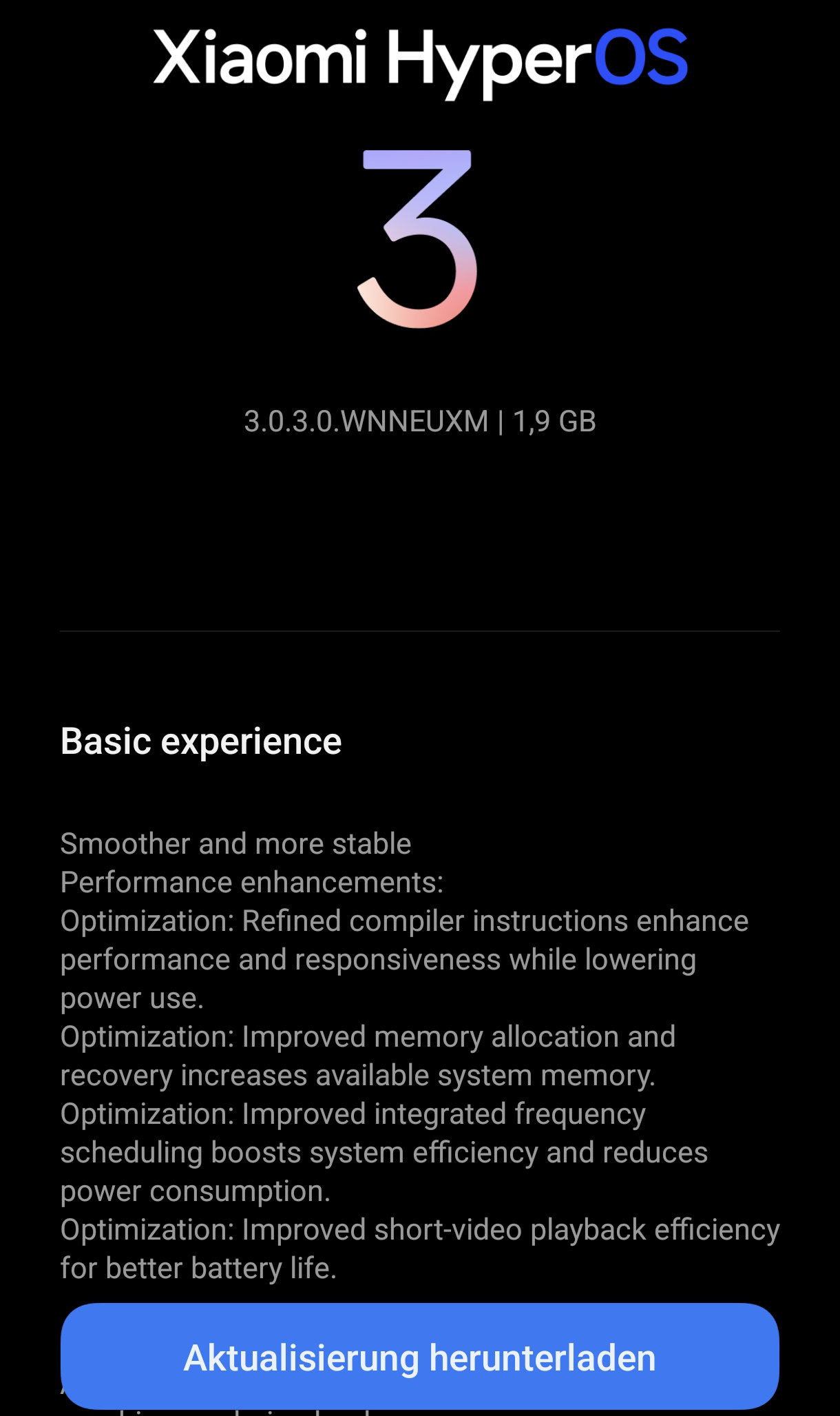 HyperOS 3 für das Xiaomi 14T Pro bringt 1,9 GByte auf die Wage und geht als Firmware 3.0.3.0.WNNEUXM in die Verteilung. Der Android-Sicherheitspatch vom Dezember 2025 ist übrigens noch nicht vorhanden. Das Smartphone steht also noch auf dem Stand vom November 2025. Weitere Verbesserungen durch HyperOS 3 sollen z. B. die Effizienz, die Performance und die Stabilität des Systems betreffen.