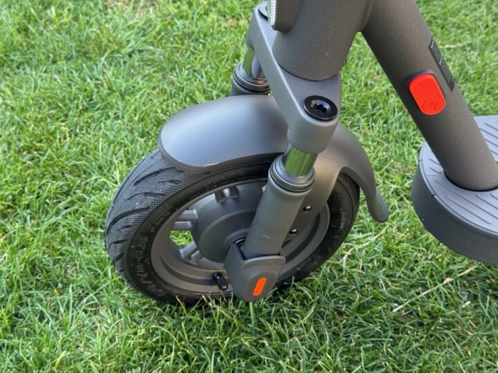 Am Vorderrad findet sich beim Scooter Elite eine Federgabel, die kleine Bordsteine oder unangenehme Schlaglöcher logischerweise nicht komplett abfedert, aber gut dämpft. Wenn man über Bordsteine fährt, wird man dennoch durchgeschüttelte Handgelenke haben. Das Trittbrett ist angenehm breit und die verbaute Beleuchtung vorn sowie hinten auch ordentlich hell.