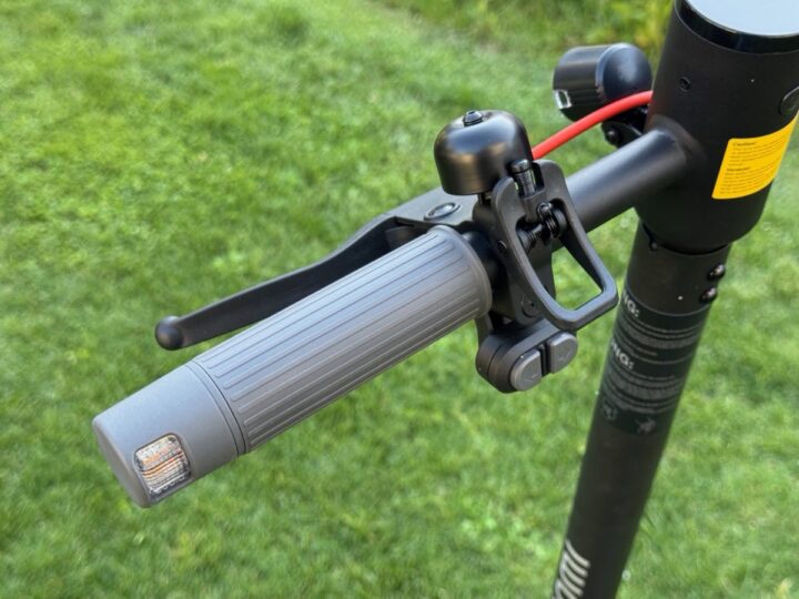 Neben dem linken Griff sind die Schalter für die Blinker verbaut, die sich rechts und links im Griff wiederfinden, sehr hell leuchten und obendrein auch nicht unbedingt leise piepen, wenn sie aktiviert sind. Die Bremse ist ebenfalls links verbaut. Rechts neben dem Griff ist dann nur noch der gewohnte Daumenhebel für den Vortrieb.