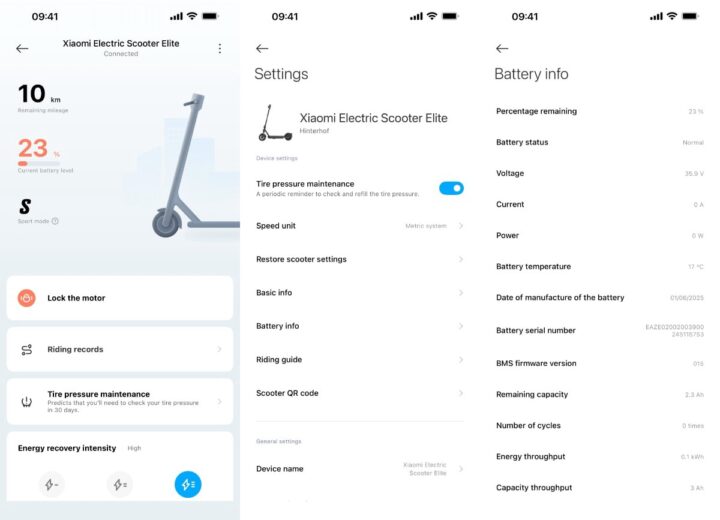 Xiaomi sagt, dass man mit dem Akku (360 Wh) gut 45 km weit fahren können soll. Das ist natürlich stark abhängig von Geschwindigkeit (dem Fahrmodus), Gewicht, Beschleunigung/Bremsen und den Anstiegen, die man bewältigen möchte. Beim gemischten Fahren mit ein paar Bergen kommt man realistisch nicht auf mehr als 35 km.