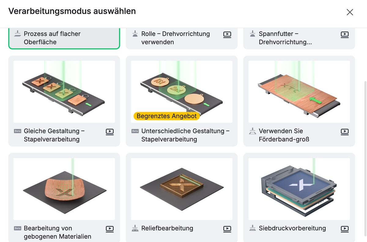 Es gibt verschiedene Bearbeitungsmodi. Für die Stapelverarbeitung kann beispielsweise auch ein Förderband als optionales Zubehör verwendet werden, was ich leider nicht ausprobieren konnte.