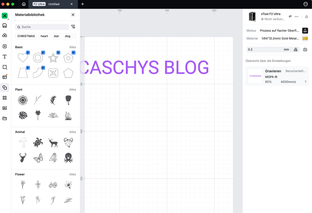 xTool hat die eigene Software, die nun unter dem Namen xTool Studio auftritt, ordentlich aufgebohrt. So werden Vorlagen jetzt besser integriert. Die Material-Einstellungen sind nach wie vor etwas doppelt gemoppelt (Material & benutzerefinierte Bearbeitungen), das würde ich mir etwas simpler – vor allem beim Abspeichern eigener Presets – wünschen.