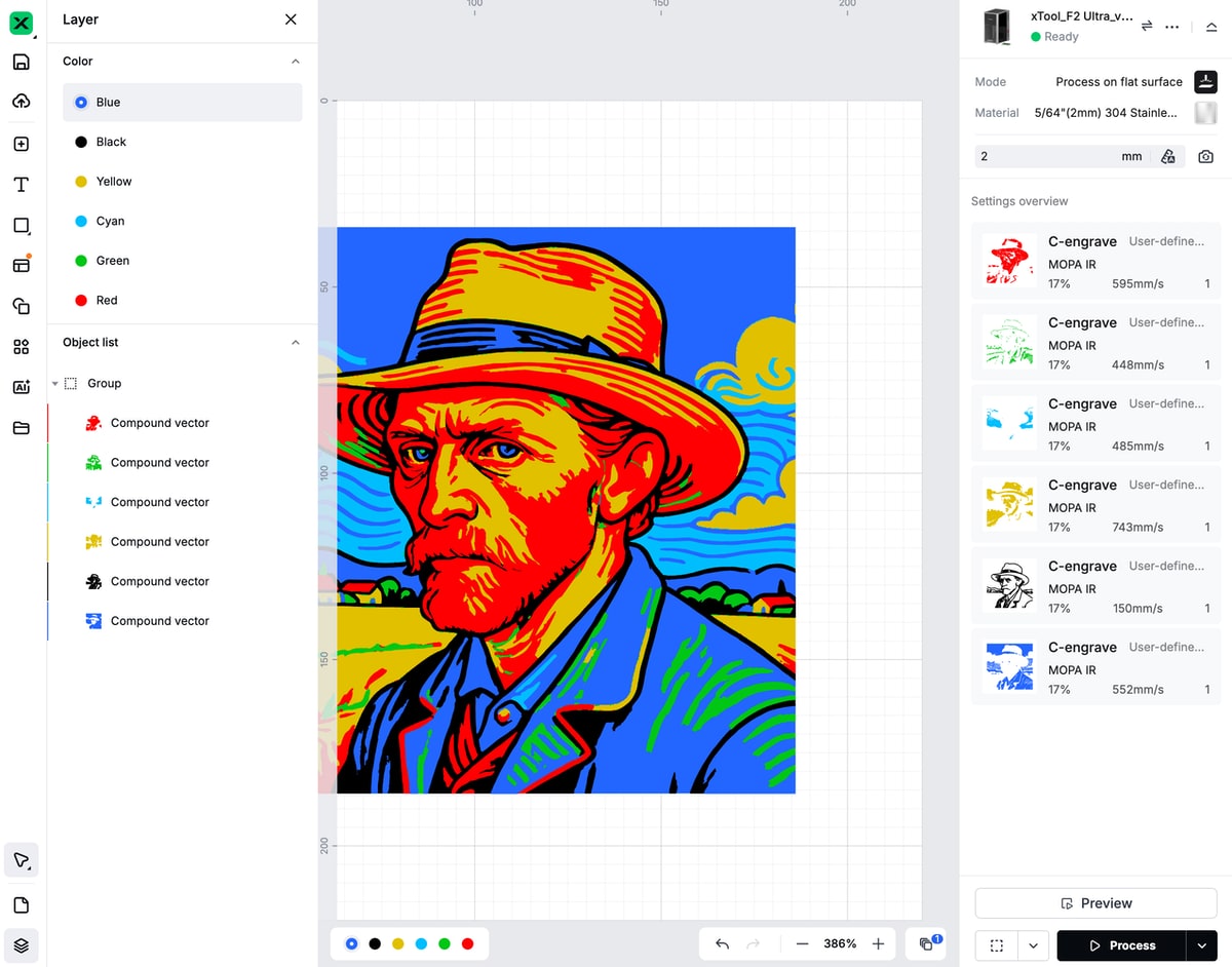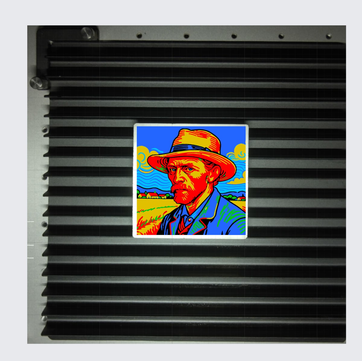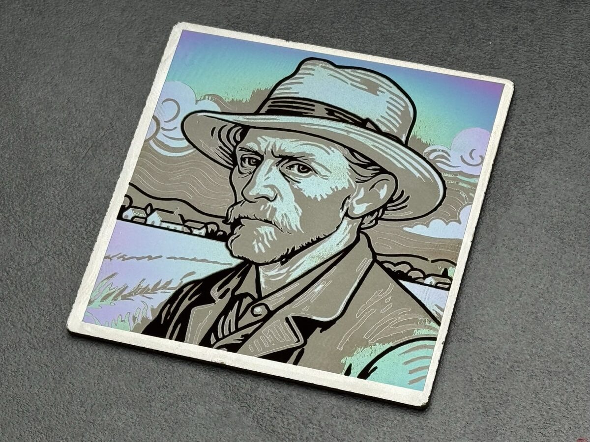 Kommen wir noch zum Spezialgebiet des MOPA-Lasers: der Farbgravur. Hierbei muss man auf Edelstahl an Material setzen. Ein MOPA-Laser ermöglicht die Farbgravur, indem er die Parameter der Laserpulse wie Pulsdauer und Frequenz präzise steuert, um kontrollierte Oxidationsschichten auf Materialien wie Edelstahl zu erzeugen. Hier spielen verschiedenste Parameter eine Rolle, entsprechend lange muss man hier auch experimentieren, um ansprechende Ergebnisse zu erzielen. Motive können durch Farbseparation dann in unterschiedliche Ebenen zerlegt werden, die je nach Farbe dann mit unterschiedlichen Parametern belasert werden. So viel zur Theorie und auch in der Praxis kann man mit entsprechender Experimentierfreude beeindruckende Ergebnisse erzielen.