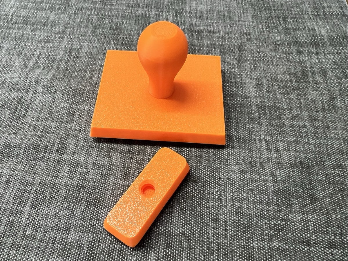 Weitere Randnotiz: Ich habe diverse Objekte mit doppelseitigem Klebeband vor dem Verrutschen geschützt, gerade wenn man wie beim Stempelgummi mehrere Durchläufe gebraucht hat und den Staub abpinseln musste. Man setzt aber auch auf Standard M5-Schrauben, mit denen man einige Dinge z.B. auch den Anschlag eines Objekts oder die Metallerhöhung am Boden fixieren kann. Da braucht man dann kein externes Zubehör, sondern kann zur Schraubenauslage im Baumarkt greifen.