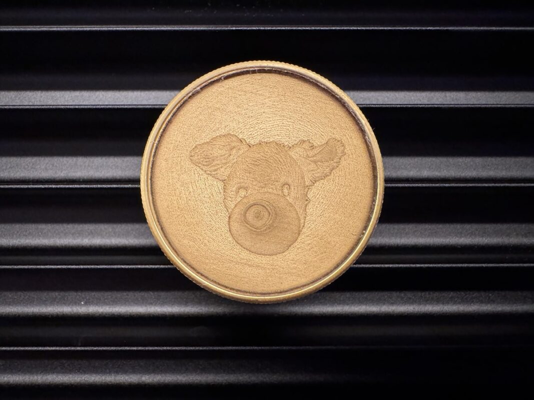 Im Falle der Tiefenkarte kann man da aber auch auf Drittanbieter-Tools zugreifen – gebt gerne mal in den Kommentaren Bescheid, falls ihr da einen Tipp habt. Ich habe auf Basis eines Bildes mit wenigen Prompts folgende Ergebnisse mit dem xTool-eigenen Tool bei der Tiefenkarte und der Messing-Münze aus dem Materialpaket erzielen können. Diese wurde knapp 1 Stunde und 20 Minuten vom MOPA-Laser beackert. Ich kann es wirklich nicht anders sagen: Absolut beeindruckendes Ergebnis, dem man mit etwas Schliff und Politur auch wieder zu Glanz verhelfen kann.
