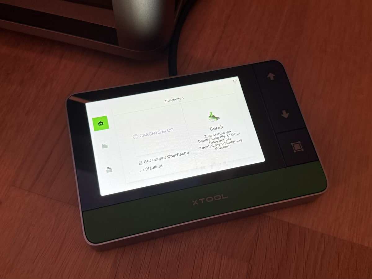 Die beigelegte Touchscreen-Steuerung erlaubt, einfach dieselbe Gravur nochmals durchzuführen oder auch einen weiteren Durchlauf für eine mehrstufige Gravur anzustoßen. Oder aber, um nochmals eine Rahmenfahrt durchzuführen. Um Projekte direkt vom USB-Stick abzurufen, habe ich die Steuerung nicht herangezogen – da habe ich lieber die umfangreichen Einstellungsmöglichkeiten der Software genutzt.